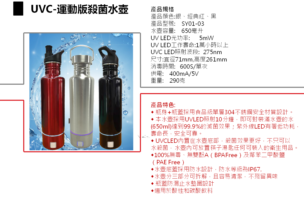 本水壺採用UVLED照射10分鐘,即可對裝滿水壺的水